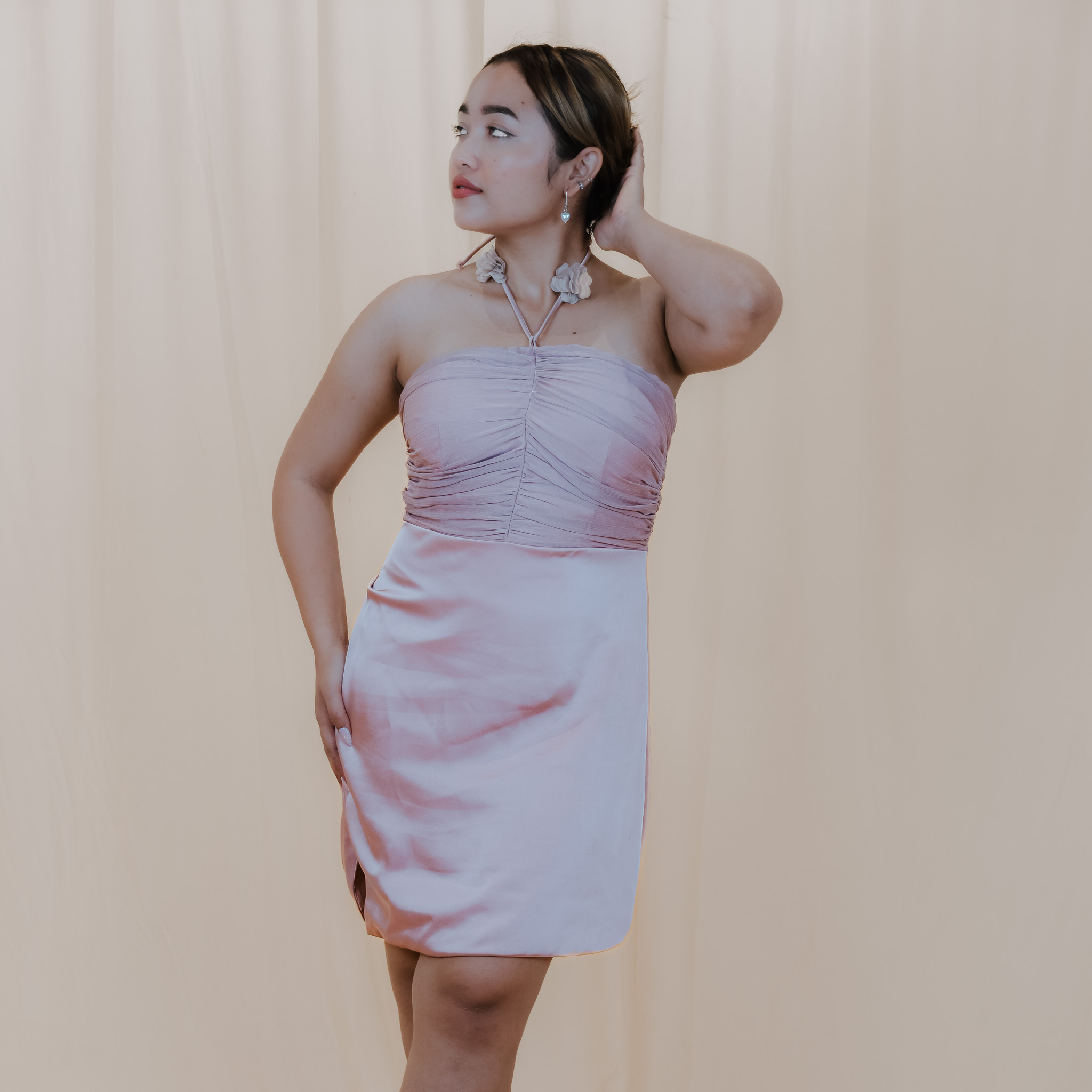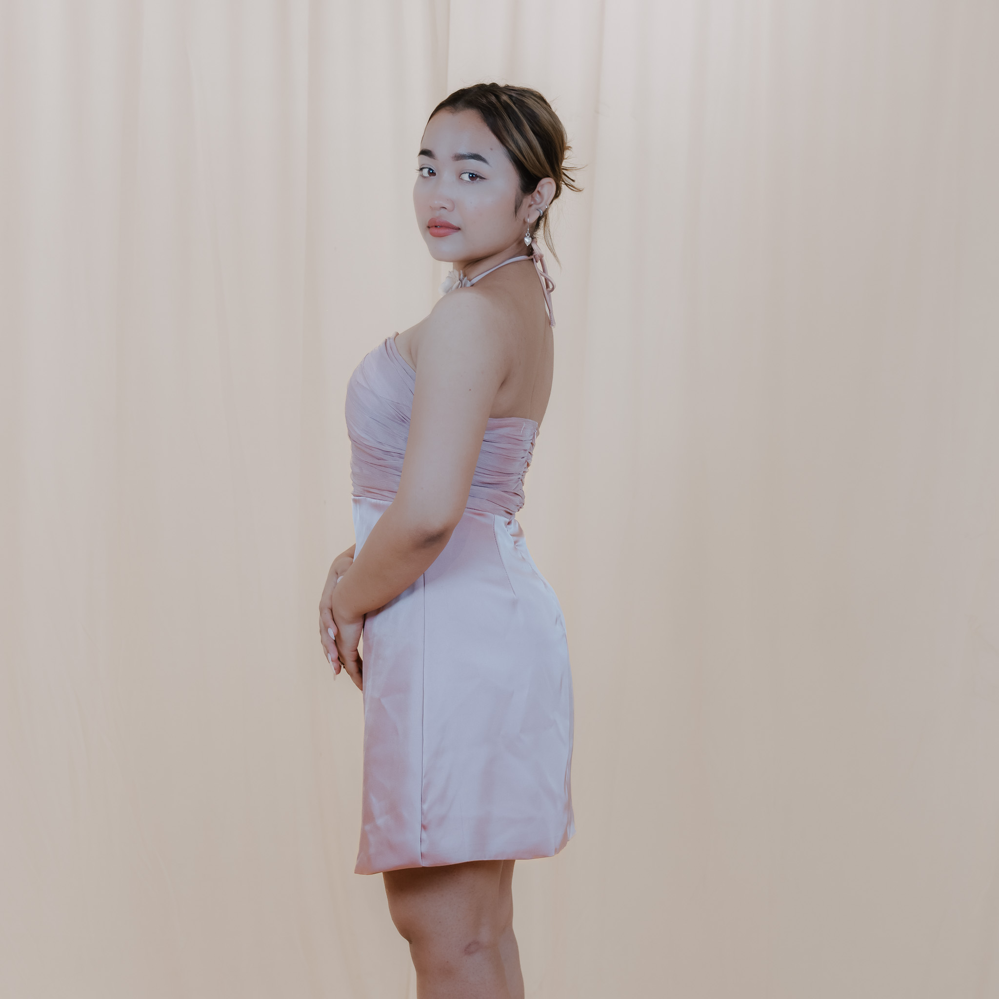 Embrace elegance with the Blush Rose Halter Satin Dress, featuring a ruched bodice and soft satin finish.