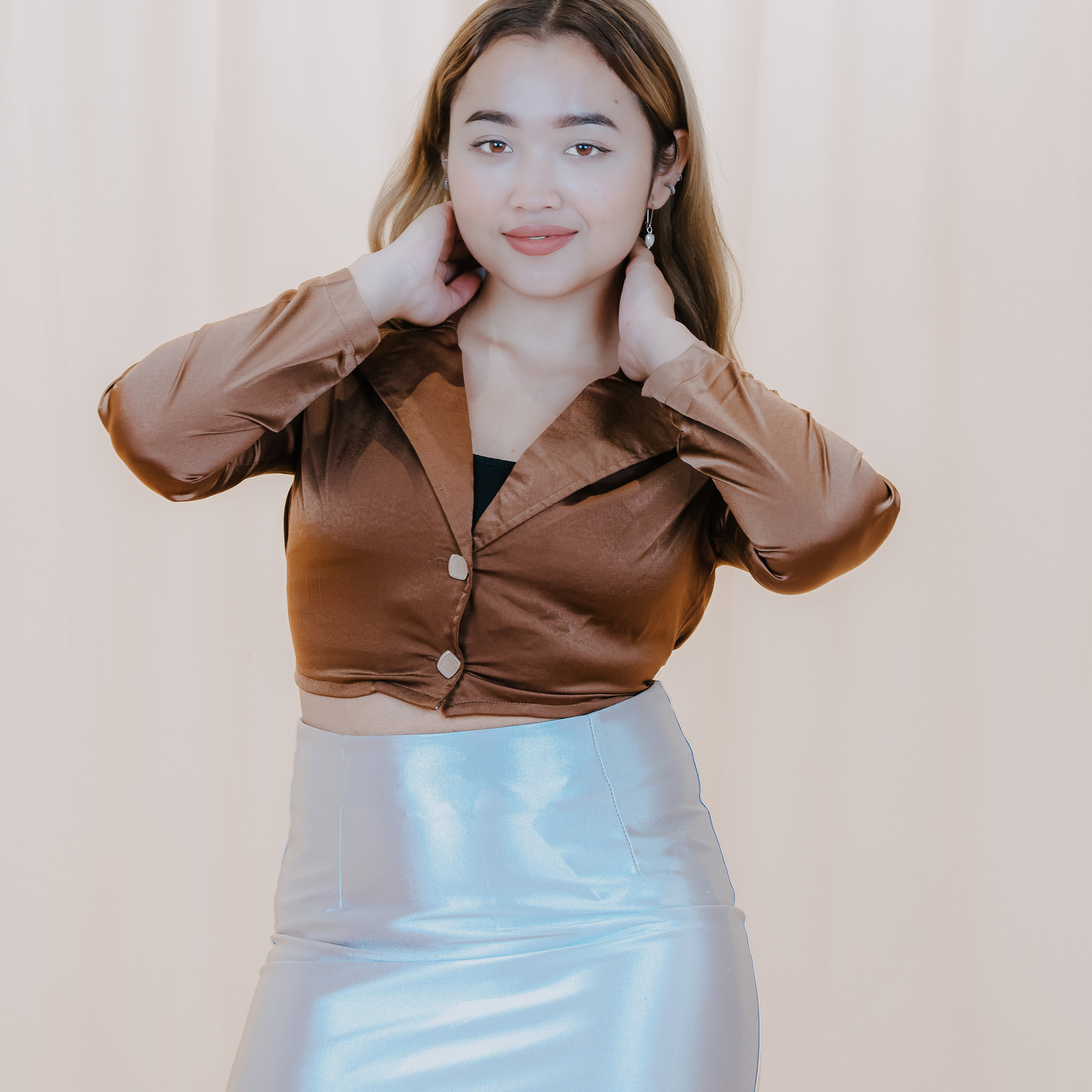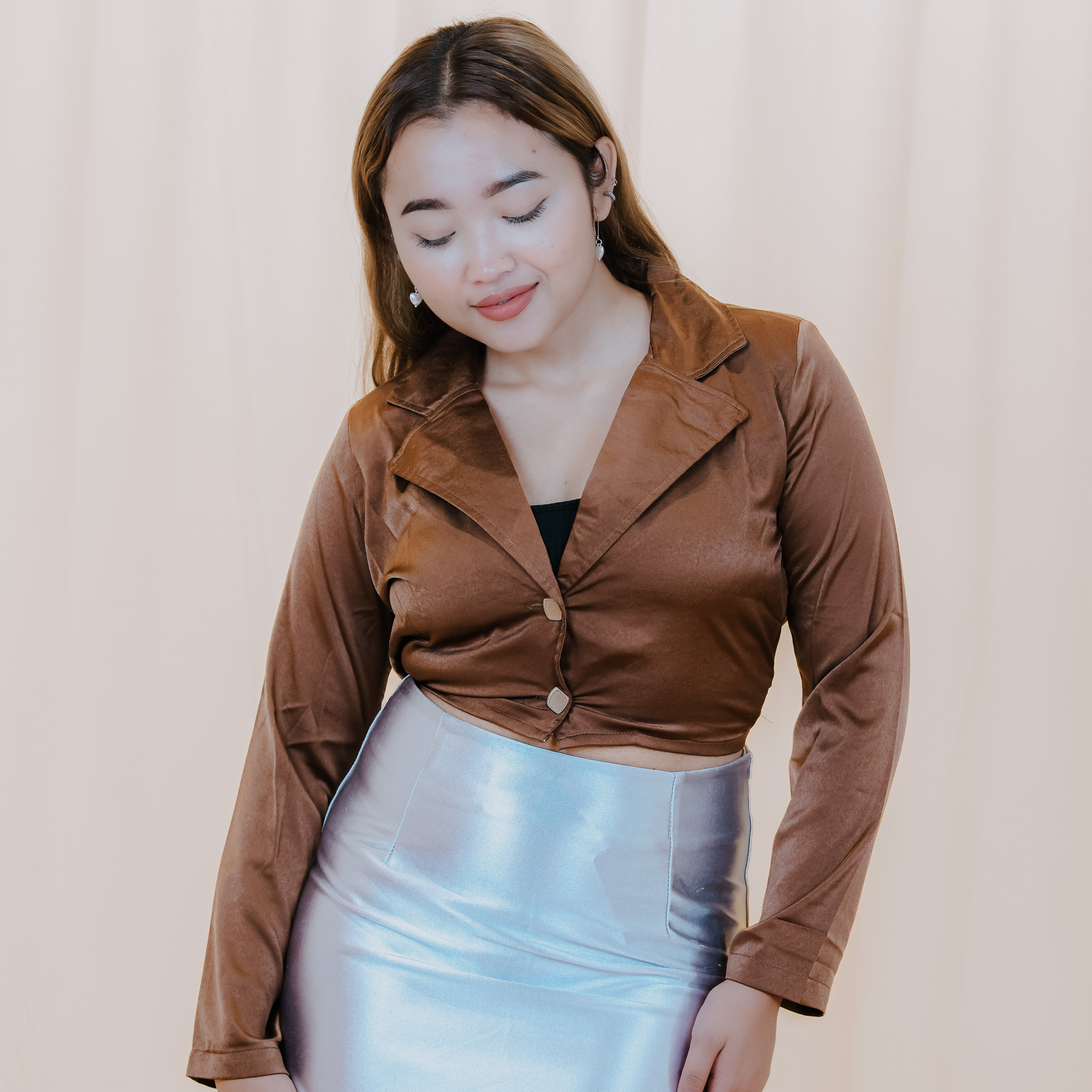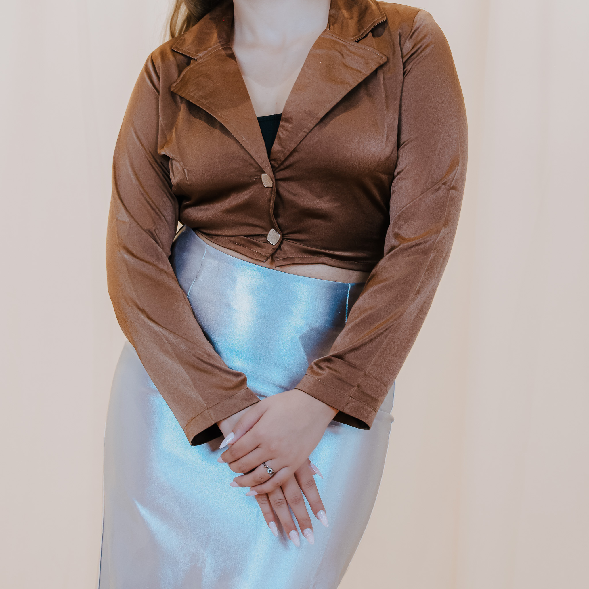 Make a bold statement with the Satin Chocolate Blazer Crop Top. This luxurious top combines the sleekness of satin with the structure of a classic blazer, featuring a rich chocolate hue that exudes elegance. The cropped cut and tailored fit make it perfect for pairing with high-waisted skirts or pants for a chic, modern look. Ideal for both formal and semi-formal occasions, this top adds a touch of sophistication to any outfit.