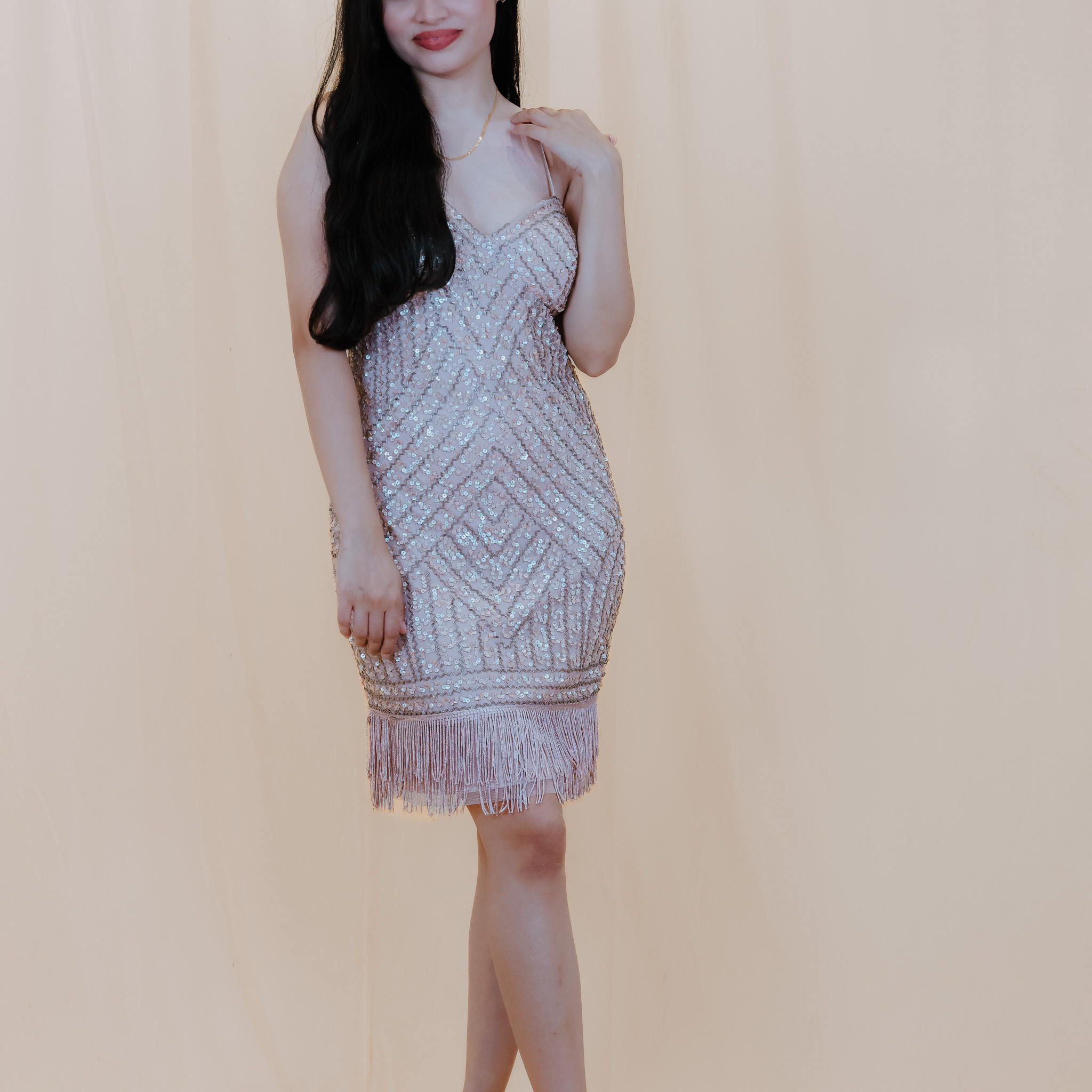 Step into the spotlight with the Silver Glamour Fringe Dress from House of Soho. This dazzling mini dress is adorned with intricate sequin patterns that catch the light from every angle. The fringe detailing at the hem adds playful movement, making it the perfect choice for a night of dancing and celebration. Ideal for parties and special occasions, this dress is sure to turn heads.