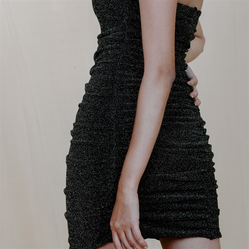 Stand out in style with our Silver Shimmer Ruched Bodycon Dress. Perfect for glam nights out!